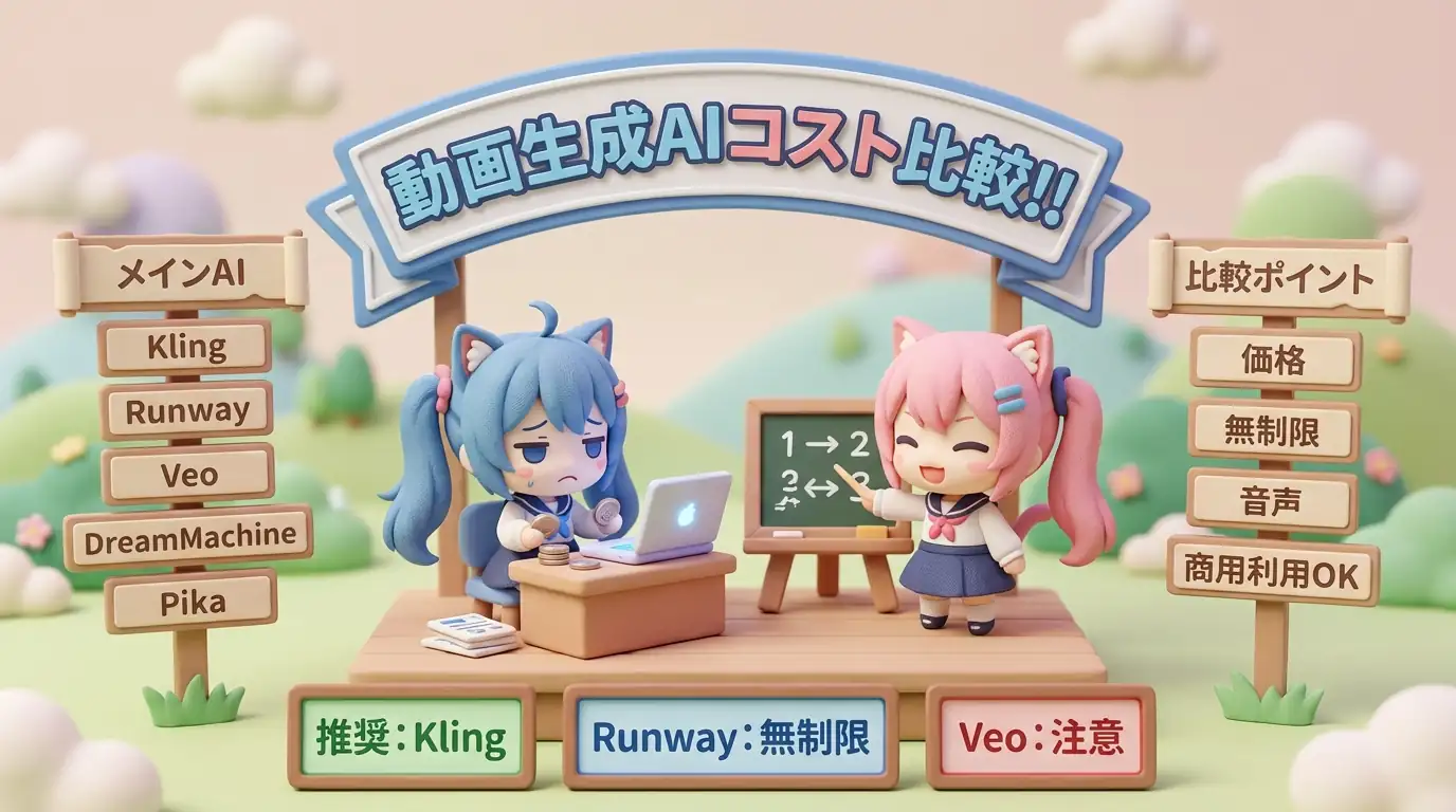 コスト比較とお得なクーポンを紹介しています。どの動画生成AIを使うか迷っている方に向けて、選ぶときの参考になるように、わかりやすくまとめています。