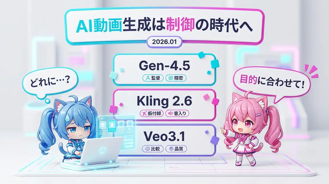 【2026年最新版】AI動画生成は「作れる」から「演出できる」時代へ。Runway Gen-4.5とKling AI 2.6、Veo3.1という3大モデルの違いを徹底比較。特にRunwayは“映画監督”のような精密さ、Klingは“振付師”のような感情演出が得意。目的別に選ぶべきモデルが明確です。