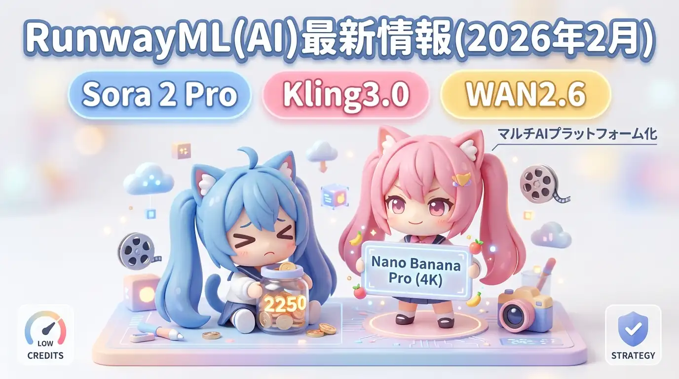 RunwayML(AI)最新情報(2026年2月版)。マルチAIプラットフォーム化が促進。Runway 内製モデルのGeN-4.5に加え、VEO3.1・Kling 3.0・Sora2 Pro・WAN2.6・NanoBanana PROの外製モデルも次々追加されていきます。
