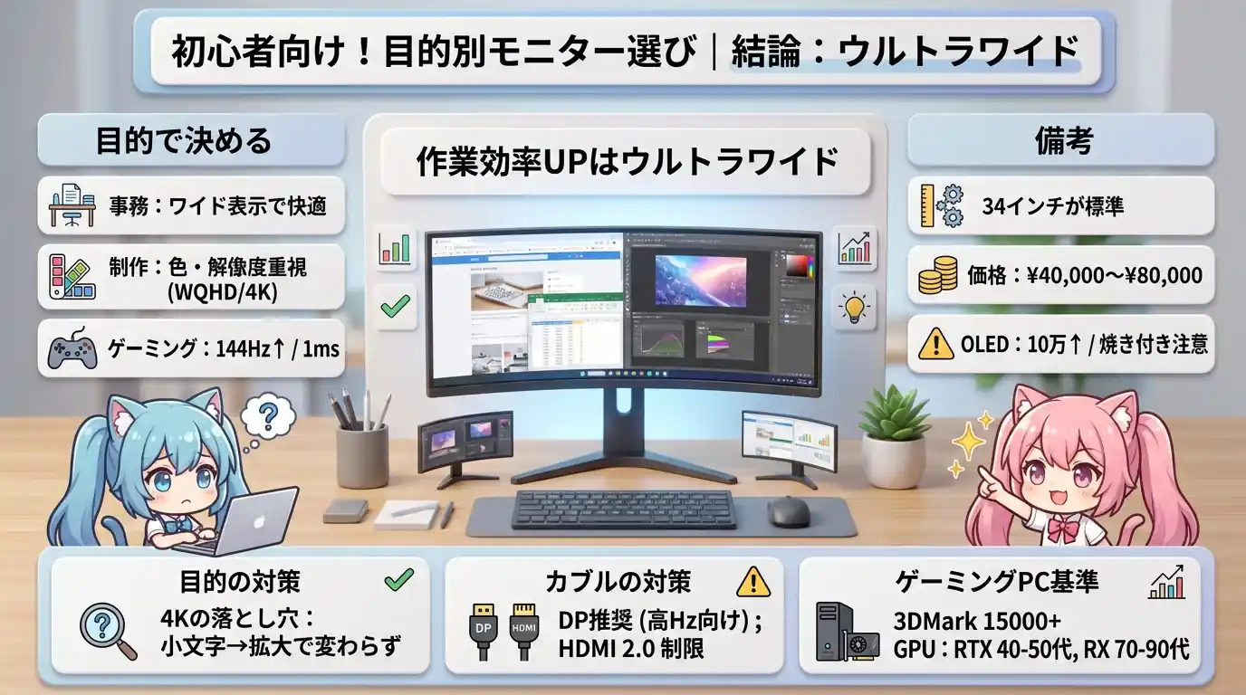この記事では、初心者でも分かりやすく目的別に最適なモニター選びを解説します。