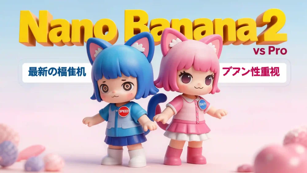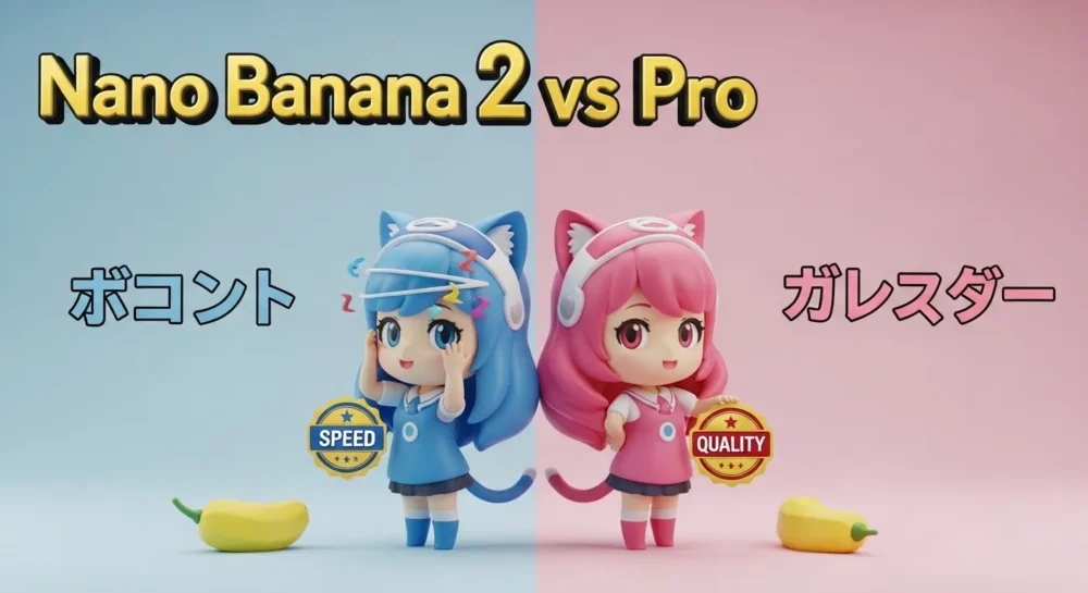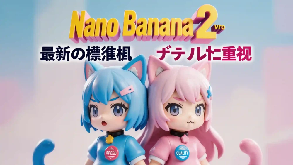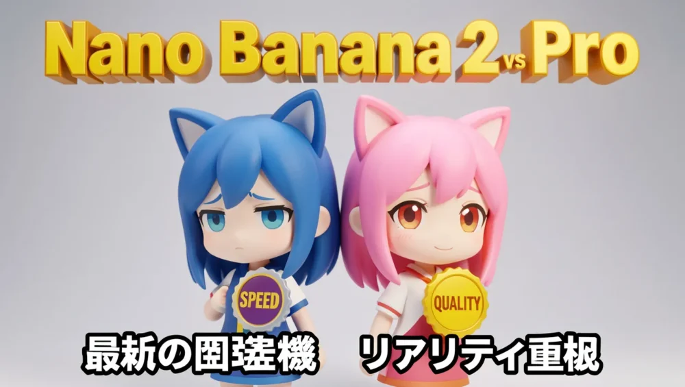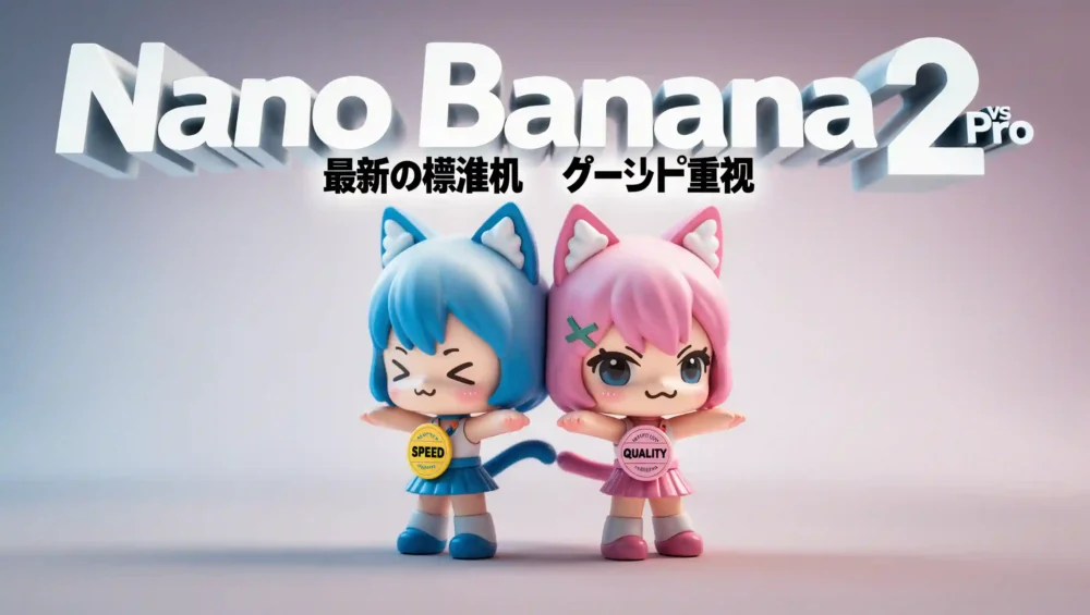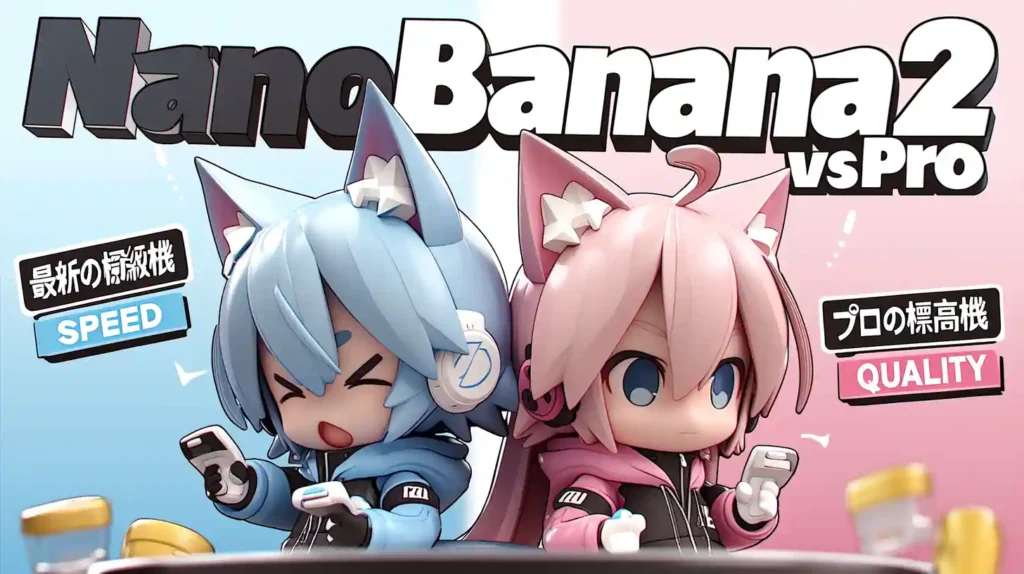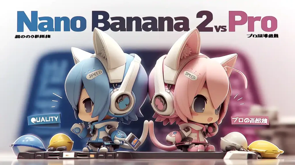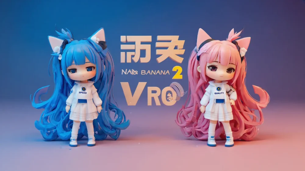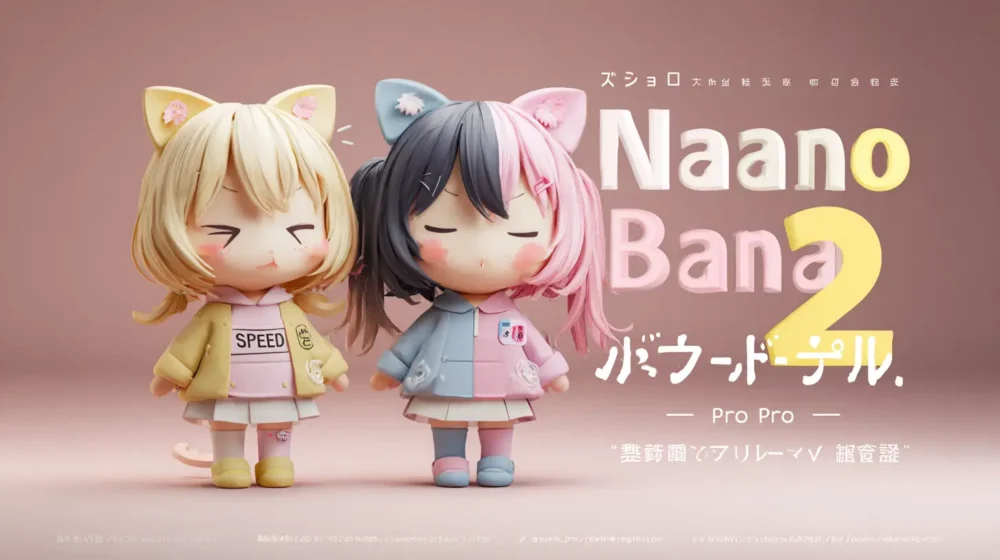ポートレート構図、3Dジオラマ。上部:巨大な3Dタイトル「ナノバナナ2 vs プロ」。