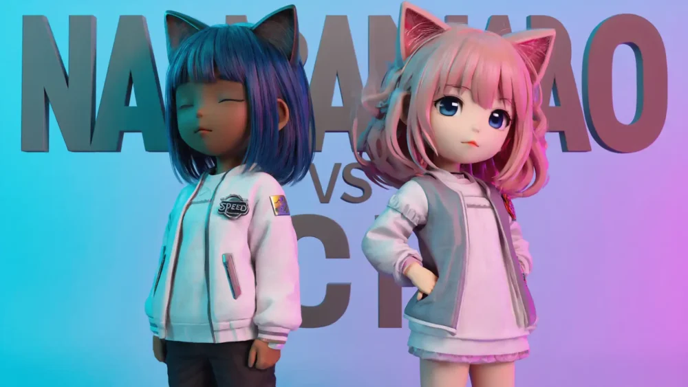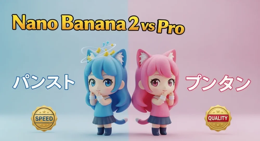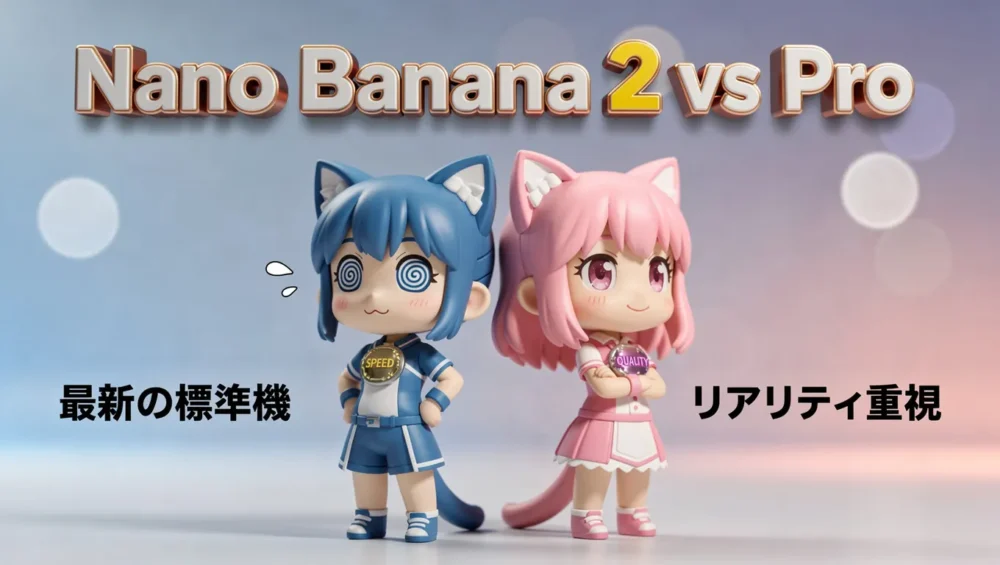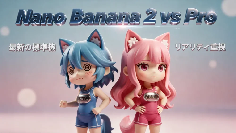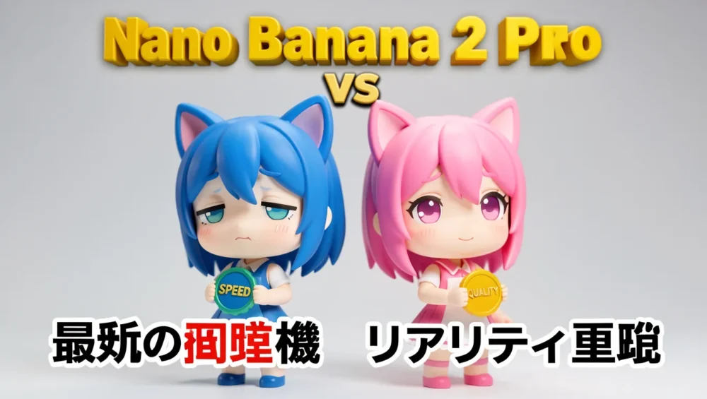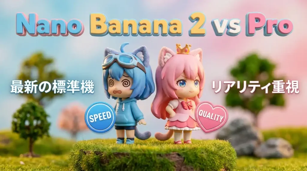 Portrait composition, 3D diorama. Top: Huge 3D title "Nano Banana 2 vs Pro". Two chibi cat-ear girls standing back-to-back. Blue girl (left) looks dizzy with a "SPEED" badge. Pink girl (right) looks proud with a "QUALITY" badge. Minimalist background with soft gradient. Large, readable Japanese labels: "最新の標準機" and "プロの高級機". Macro photography style, shallow depth of field, vivid colors, high-resolution textures, no UI screenshots.