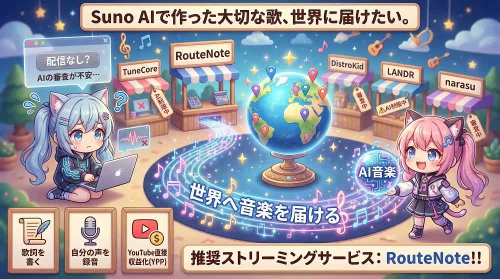 | Ditto Music | ❌ 拒否報告あり | アーティストとしての実績があっても、Sunoを使用した楽曲だけピンポイントで拒否されるケースが確認されています7。 |