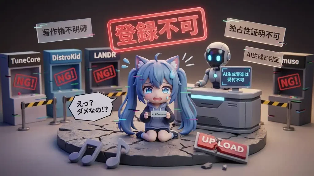 「ねえ、聞いてよ!この前作った自信作を『DistroKid』にアップしようとしたらさ、なんか英語で怖い警告が出て弾かれちゃったの!私の曲、AIっぽすぎるから嫉妬されたのかな?」