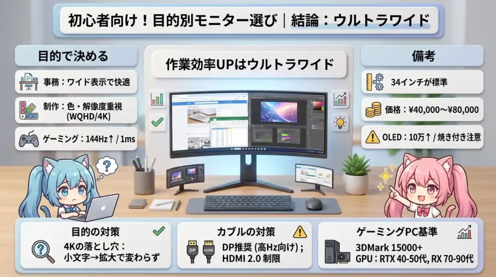 モニター選びで最も重要なのは、「何のために使うか」を明確にすることです。