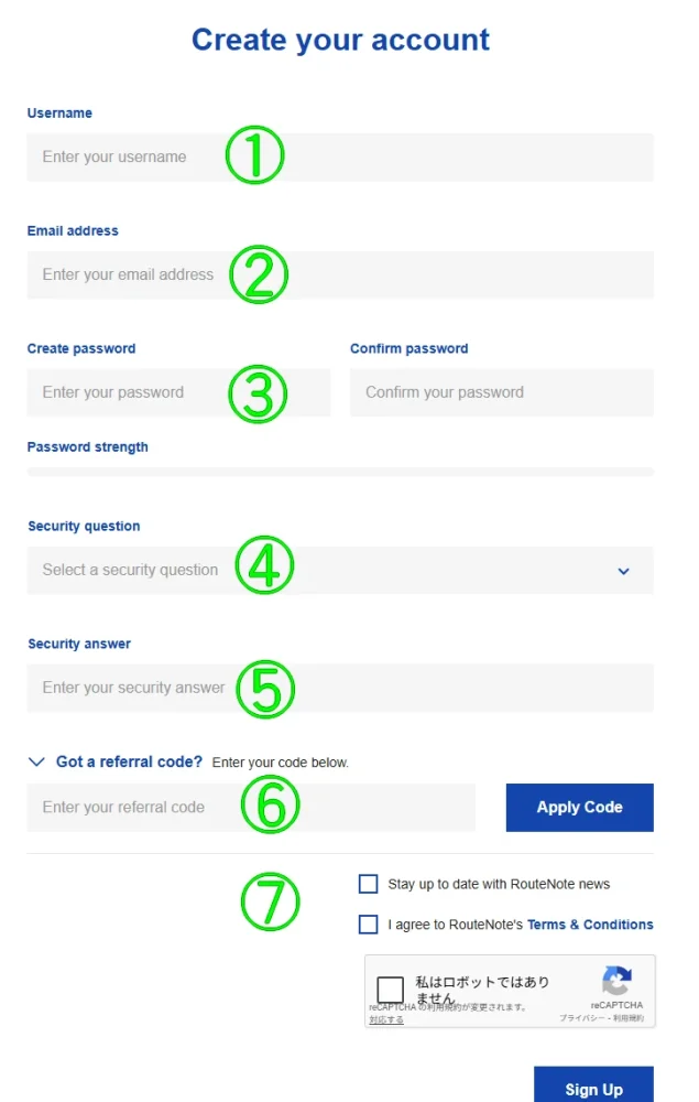 この手順は、RouteNoteにアカウントを作成する際の説明のようですね。以下は、それぞれのステップについて簡単に解説します。
