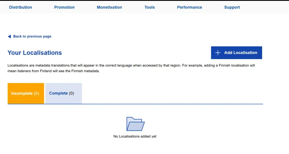 画面右側にある青いボタン + Add Localisation をクリックしてください。
