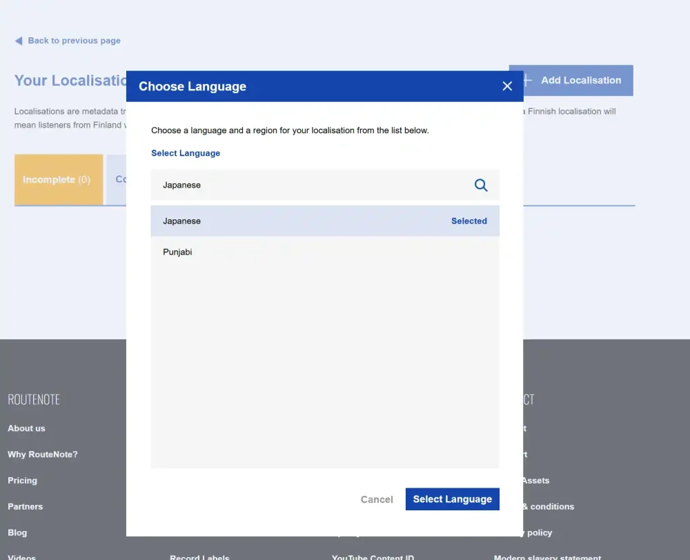 「Your Localisations(ローカライズ設定)」画面は、日本のリスナーに向けて