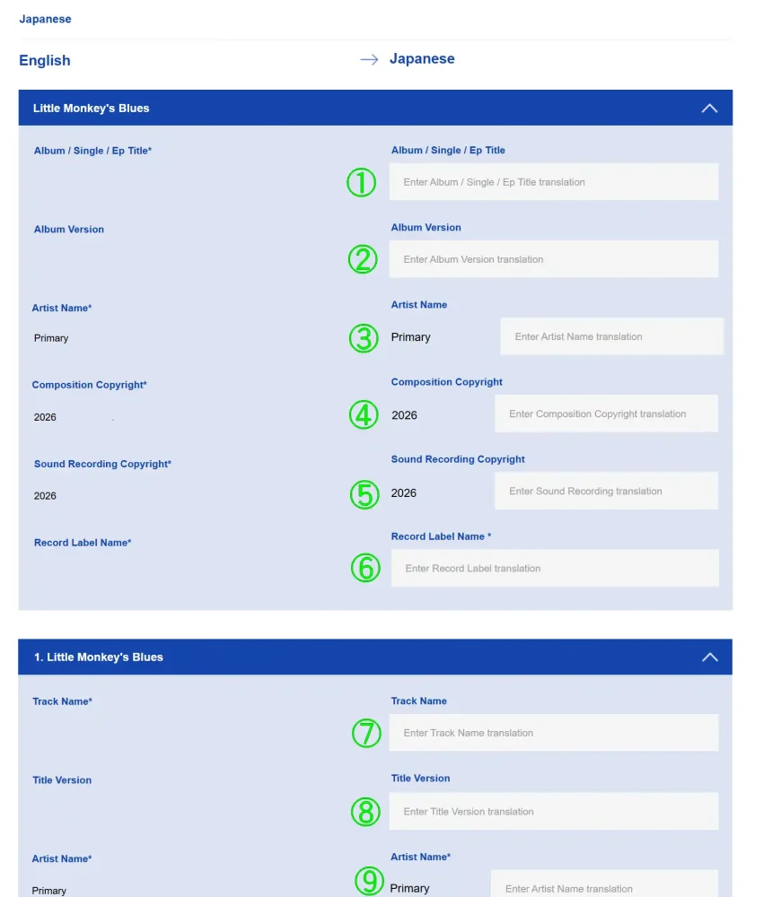 ここで日本語を追加しないと、日本のSpotifyやApple Musicでもローマ字のまま表示されてしまいます。