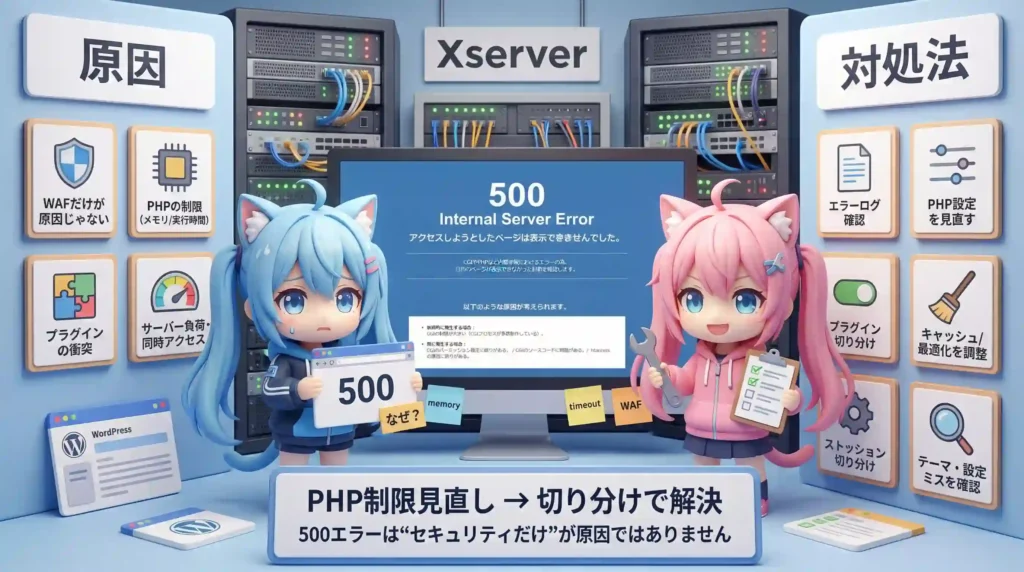 Xserverでフォーム保存時に500エラーが出る場合、WAFを疑う前に以下の3点を確認しましょう。